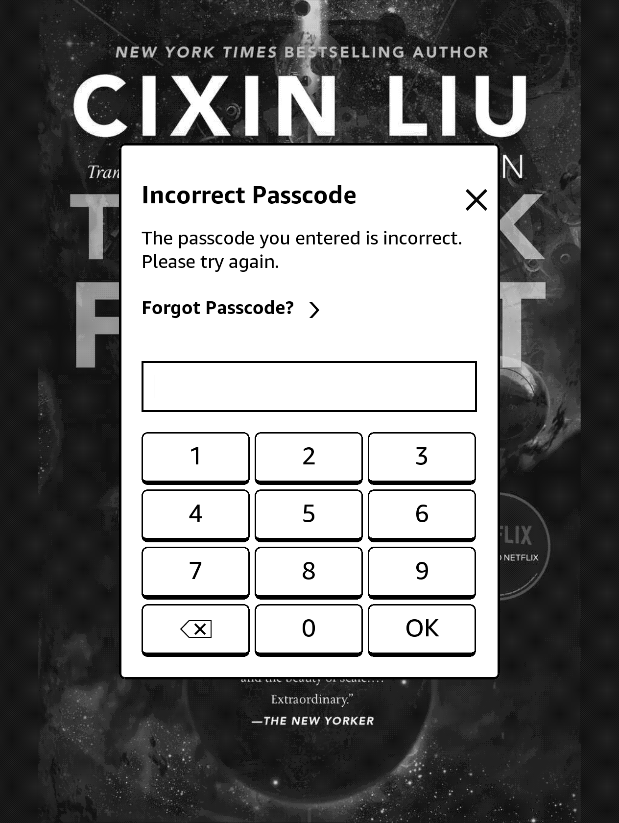 When you assign a passcode to your device, every time you lock the screen it will prompt you for a login to return to your book. This is usually a short and easy process since the recessed lock button makes it difficult to accidentally lock the device but, in the event that you accidentally enter your passcode incorrectly, you get a popup in the modal notifying you as such and prompting you to click Forgot Passcode? to trigger the passcode reset process. This popup shifts the entire keypad downwards, throwing off the layout of the modal by an entire key and causes me – as a user – to have to recalibrate in order to reenter my passcode with the refreshed UI.